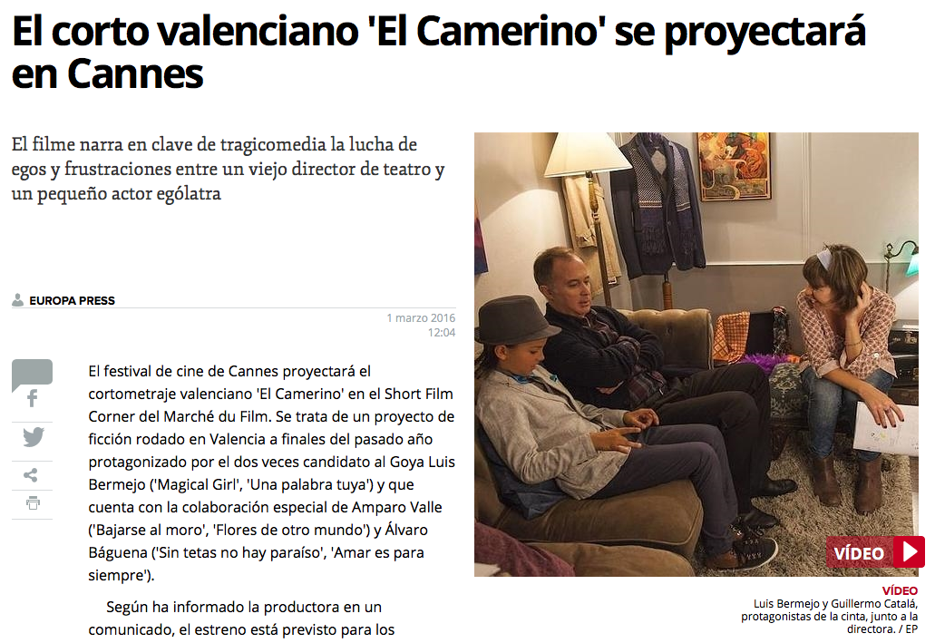 Las Provincias habla de ‘El Camerino’ Publicado poranaramonrubio3 marzo, 201620 enero, 2018Publicado en HEMEROTECAEtiquetas:ana ramon rubio, cannes, cortometraje, el camerino, festival cannes, short film corner La edición digital del diario Las Provincias habla de El Camerino en el short film corner de Cannes en este artículo. Comparte: Compartir en X (Se abre en una ventana nueva) X Comparte en Facebook (Se abre en una ventana nueva) Facebook Me gusta Cargando... Relacionado Publicado por anaramonrubio . Ver más entradas