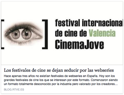 El Lablogatorio de RTVE publica este artículo sobre los festivales de cine que empiezan a interesarse por las webseries a raíz de la nueva sección de Cinema Jove que coordinamos María Albiñana y yo. El artículo puede leerse completo aquí.