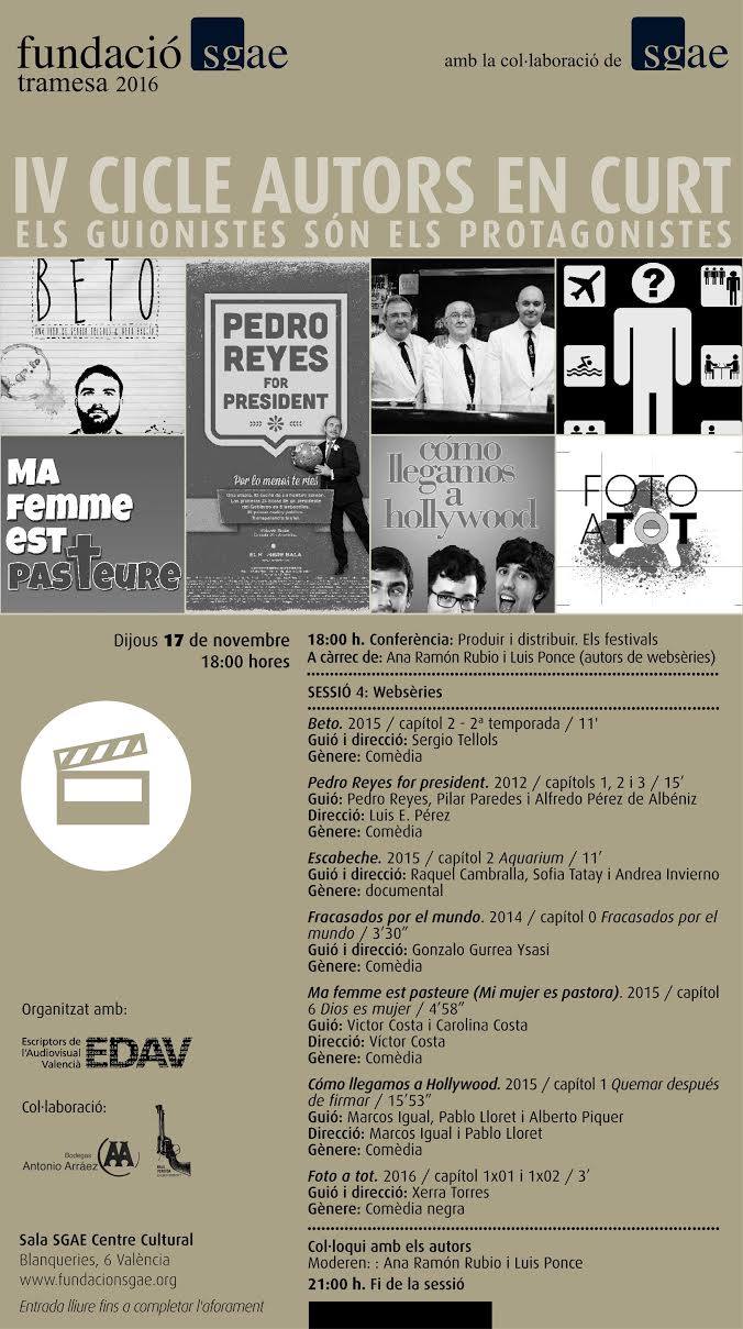 Esta semana se celebró el último ciclo de ‘Autors en curt’ de SGAE con EDAV. El realizador valenciano Luis Ponce (‘La Gente es imbécil’) y yo tuvimos el placer de coordinar este evento, donde proyectamos 7 webseries valencianas y hablamos con los creadores sobre producción y distribución de series web.
